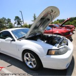 For a first-time event, we couldn’t have been happier with the quality of the turnout for the SVTPerformance/CJ Pony Parts Exhaust Competition. We had 10 beautiful Mustangs from all eras and they all had great-sounding exhaust systems.Like the SVTP Burnout contest, the winner of the exhaust competition is chosen by the crowd reaction. The idea was for the crowd to chose the exhaust tone that they liked the best, so it wasn’t necessarily the car with the loudest exhaust that would win.The rules were quite simple. Overseen by our own SID297 each contestant would start their car, rev the engine to 3,000 rpm, rev the engine to 5,000 rpm, and then they could rev however they liked for the remainder of their 45-second window. After session completed, SID would rev up the crowd for its reaction.Making history as our first Exhaust Competition winner, this 2004 Mustang Cobra earned the loudest cheer from the crowd. Its exhaust system consists of MAC long-tube headers, a Lethal Performance catalytic X-pipe, a Magnaflow after-cat, and its secret weapon—electrically actuated exhaust cutouts.Now our sponsor CJ Pony Parts provided goody bags for all the contestants, but only winner Michael Anthony, owner of the 2004 Mustang Cobra, took home the $500 gift card from CJPP as his grand prize. Congrats Michael!We want to thank everyone who came out to the SVTP Cruise-In to participate and judge the Exhaust Competition. However, only Michael, the big winner, scored a photo with our leader, SID297, and his CJPP gift card prize.